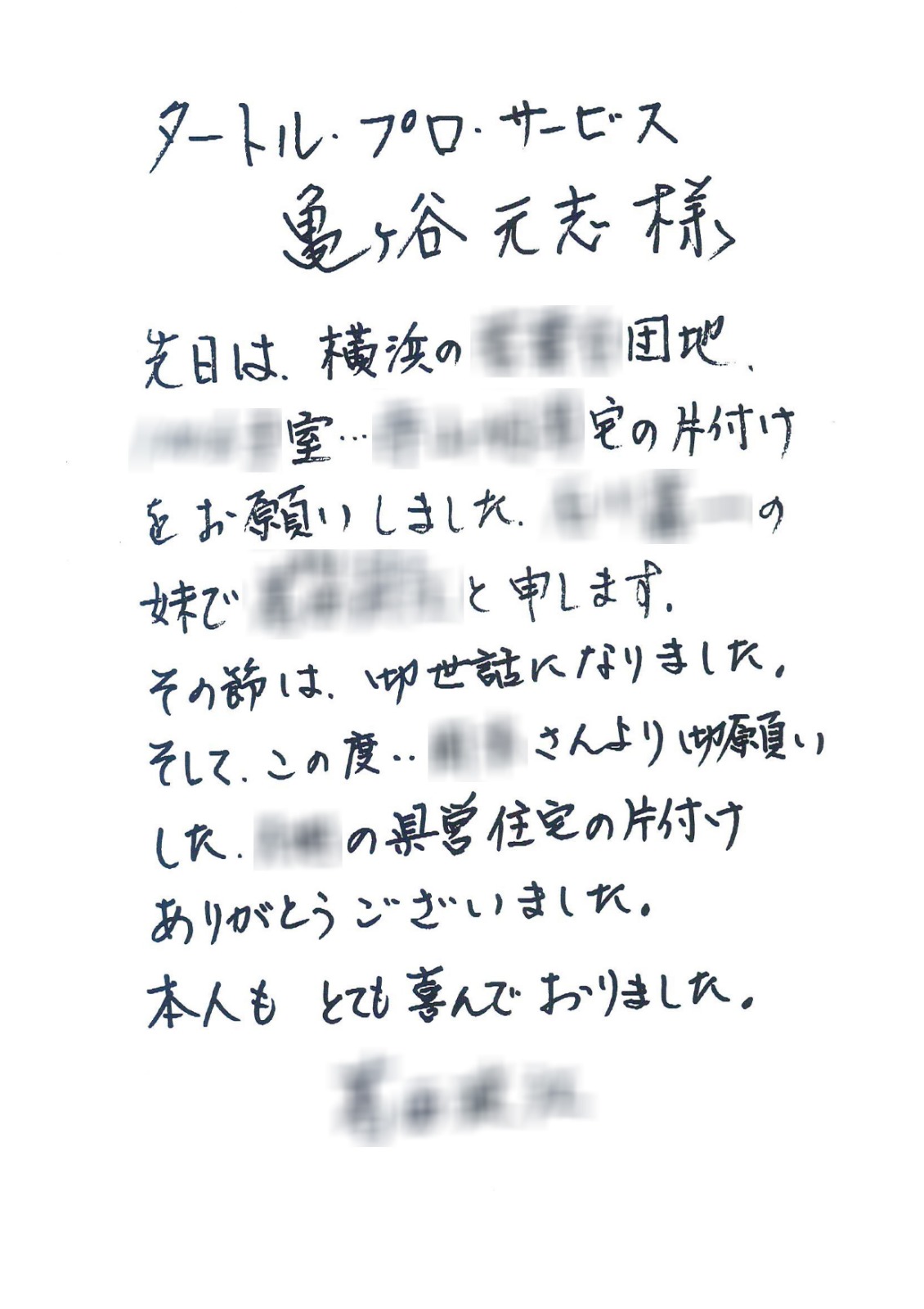 数か月前に横浜市にて遺品整理を施工致しましたK様からのご紹介で先日、川崎市O様のお父様宅の遺品整理を施工させて頂き、昨日会社にご紹介者のK様から御礼のFAXを頂戴致しました。